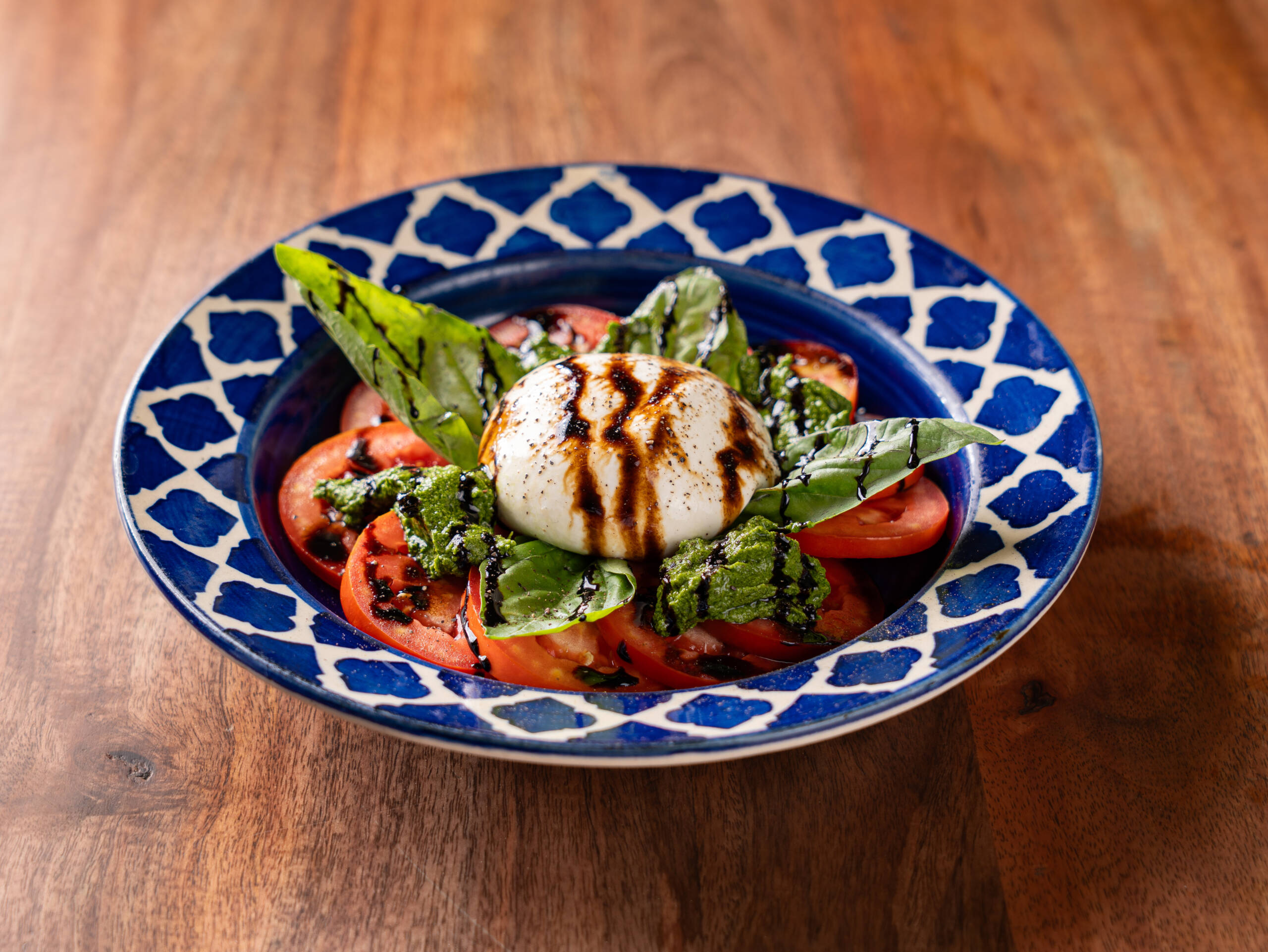 Creamy burrata cheese with ripe tomatoes, basil pesto and balsamic glaze.