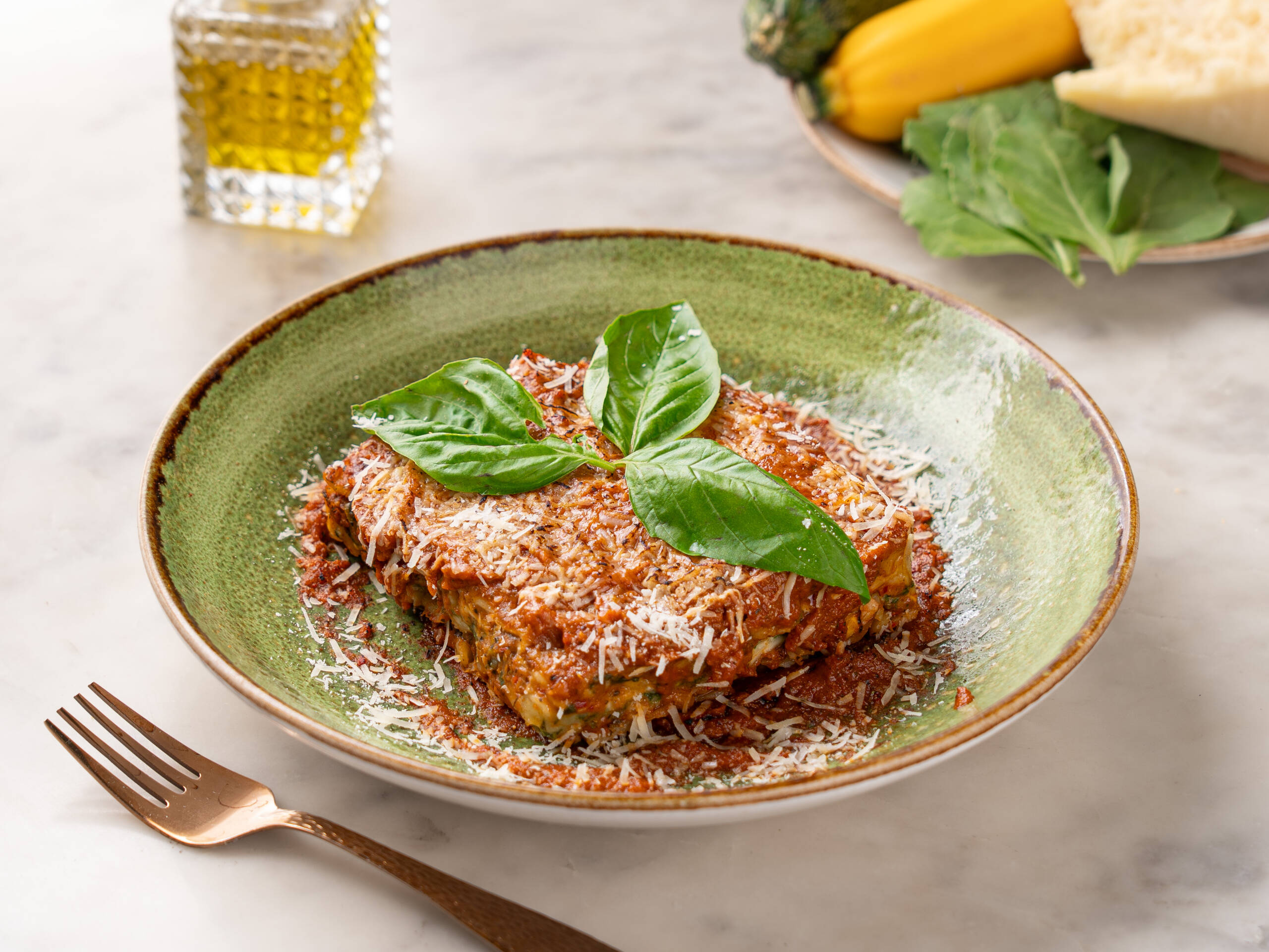 Lasagna layers with minced chicken, tomato sauce, spinach & béchamel.