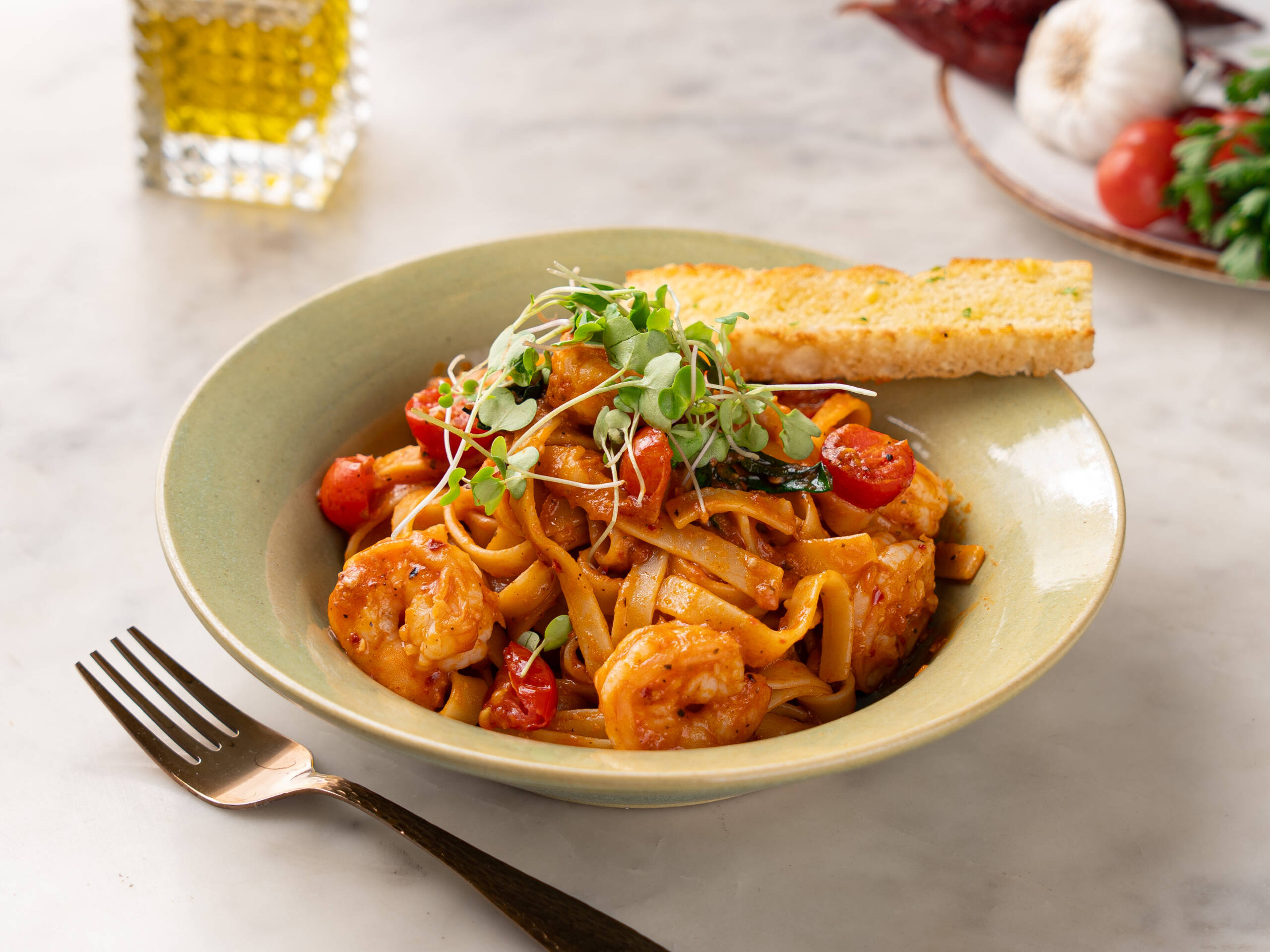 Garlic, red pepper flakes and parsley-infused olive oil with cherry tomatoes and prawns.